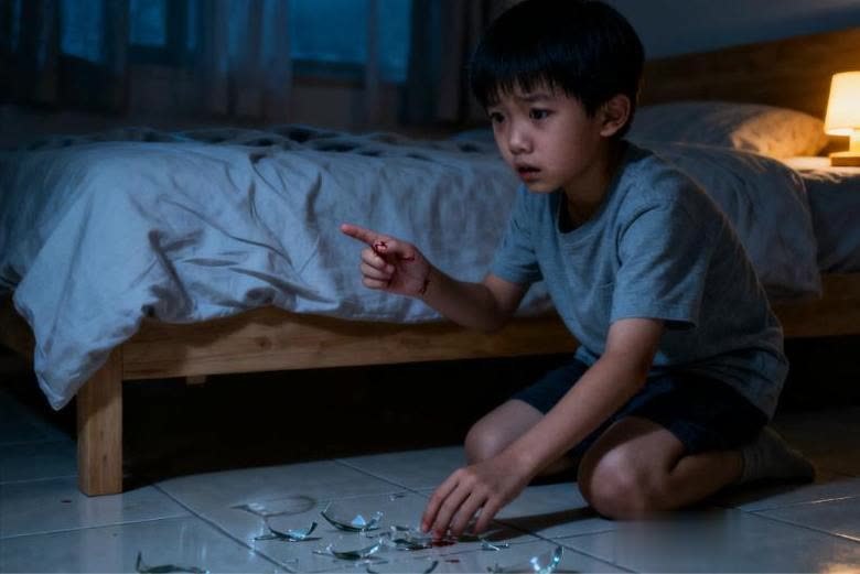 更糟的是,孩子惊醒后看到自己的“杰作”,因为害怕被责备,竟徒手去捡碎片,手指被划了一道口子。